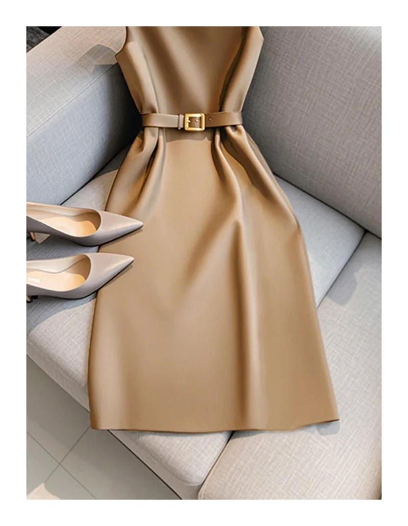 Elegant Women's Formal Dress With Belt Summer New Fashion Solid Color O-Neck Sleeveless High Waist OL Midi Party Vestidos
