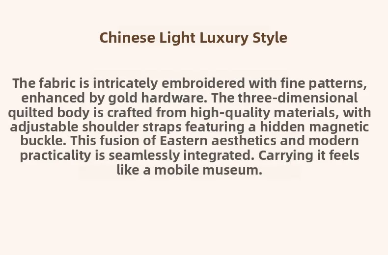 Infused with artistic Chinese elements, this bag exudes a unique charm that sets it apart from ordinary designs.