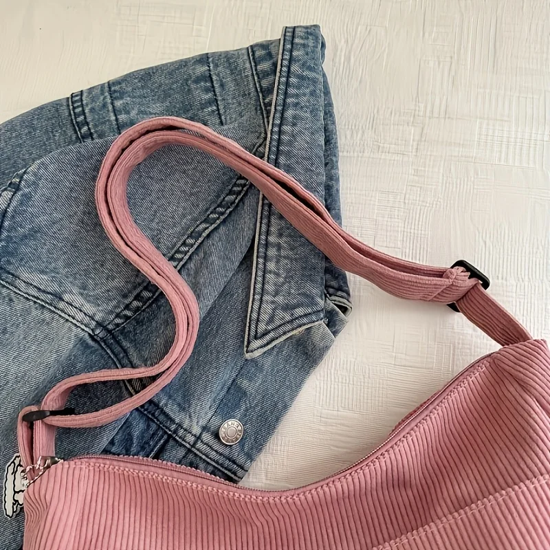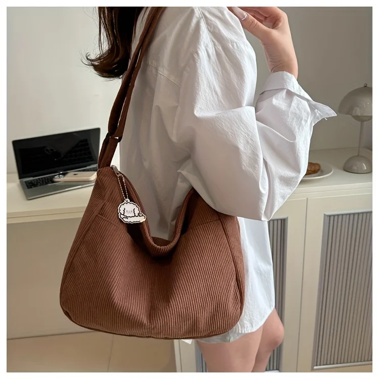 Women’s Corduroy Shoulder Bag, Casual Striped Large Capacity Tote with Zipper Closure, Cute Hat Patch, Perfect for Everyday Use